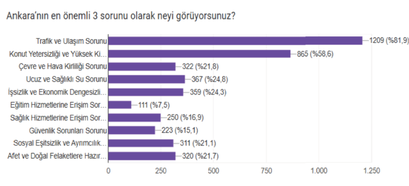 Memur-Sen’in Ankara genelinde yaptığı araştırmada, katılımcılara “Ankara’nın en önemli üç sorunu nedir?” sorusu yöneltildi. Ankete verilen cevaplar, başkentin en büyük probleminin açık ara trafik ve ulaşım olduğunu ortaya koydu. Buna göre 1.209 katılımcı (%81,9) trafik ve ulaşımı kentin temel sorunu olarak işaretledi.
